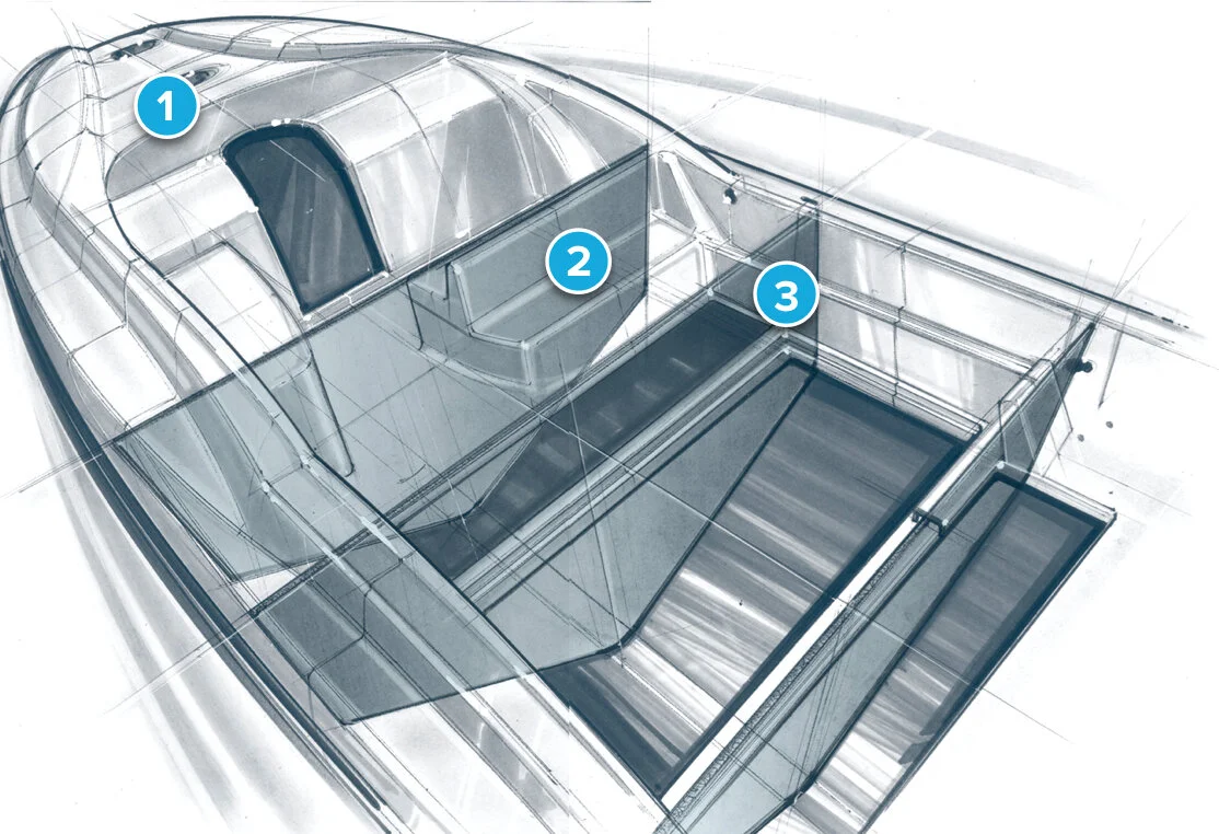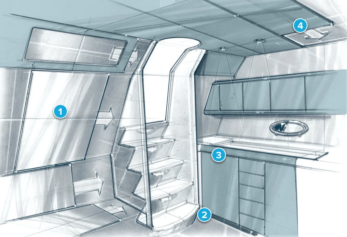 1 Hatches / 2 Flooring / 3 Cabinets / 4 Ceiling panels