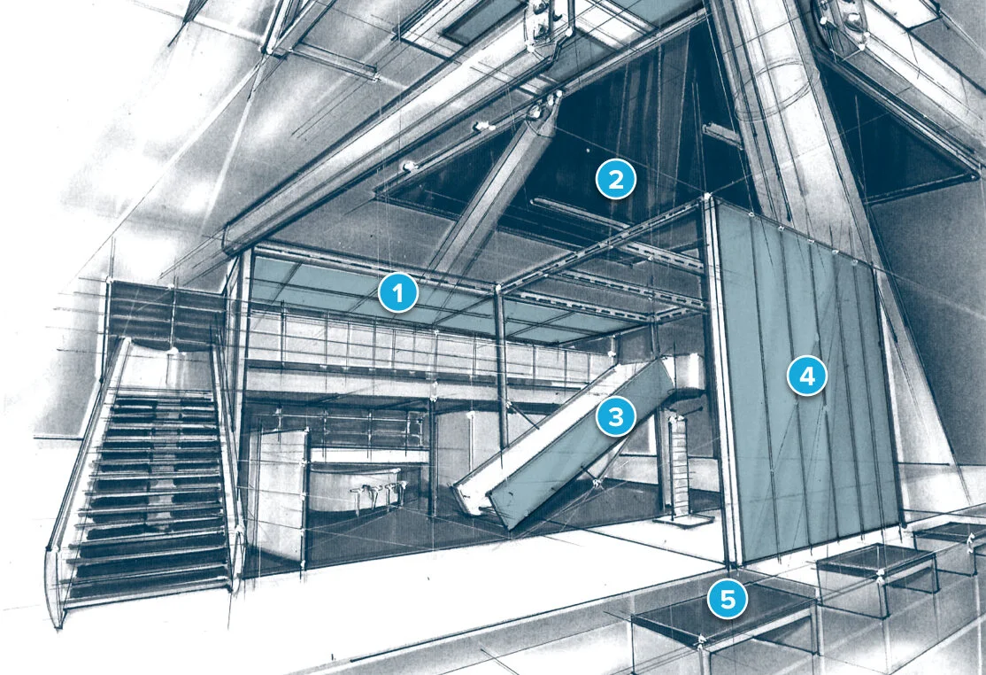 1 Ceiling panels / 2 See-through daylight panels / 3 Lightweight panel replacement / 4 Exterior walls / 5 Furniture